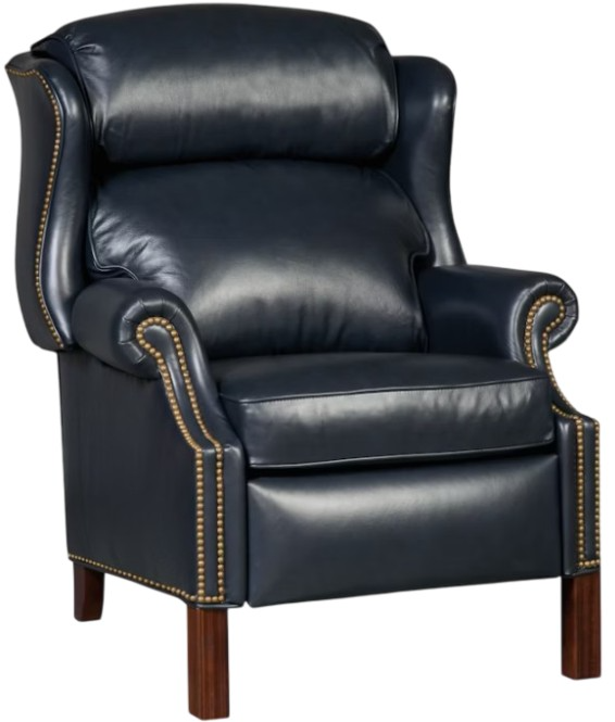The Presidential reclining wing chair with brass nails is offered in hundreds of leather options and includes a standard nailhead trim #9 in French natural finish. Other decorative nailhead finishes are available. Comes with a standard mahogany finish but other finishes are available.Read More