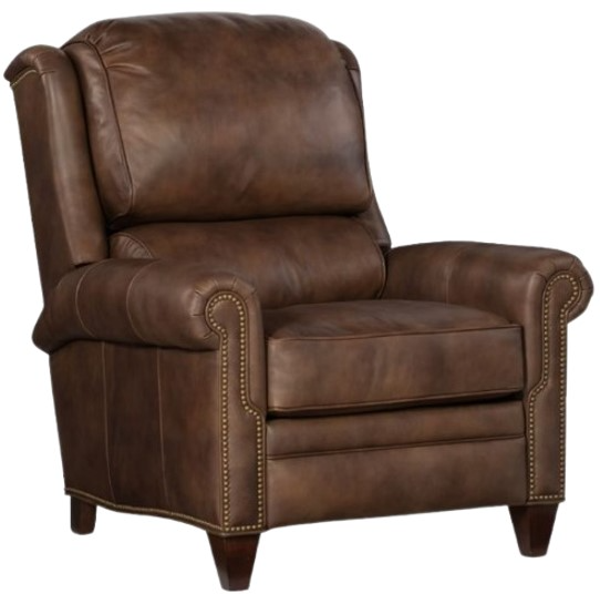 The William Recliner features traditional styling with a spring down cushion and bustle back cushion. The mahogany finish and #9 natural nailheads come standard, however, other finishes and nailhead are available. Pushback recline is standard with an optional power button available for an upcharge.Read More