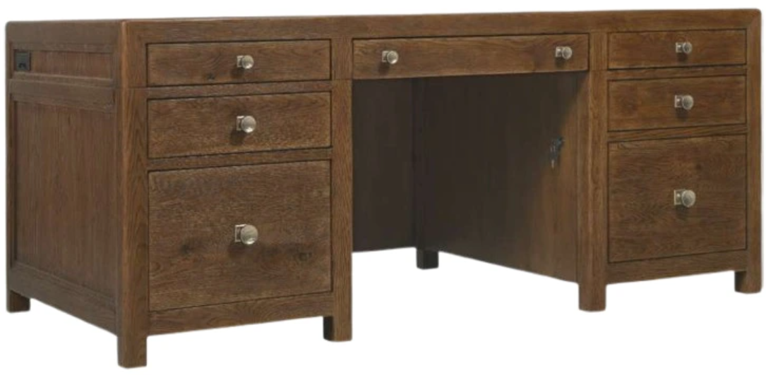 Experience refined craftsmanship with the Driftwood executive desk in worn saddle finish. Its deep, burnished tones and supple leather-inspired patina evoke a sense of vintage luxury, ideal for creating a sophisticated executive suite. Featuring seven functional drawers, including file storage and adjustable shelving, this desk is both beautiful and practical.Read More