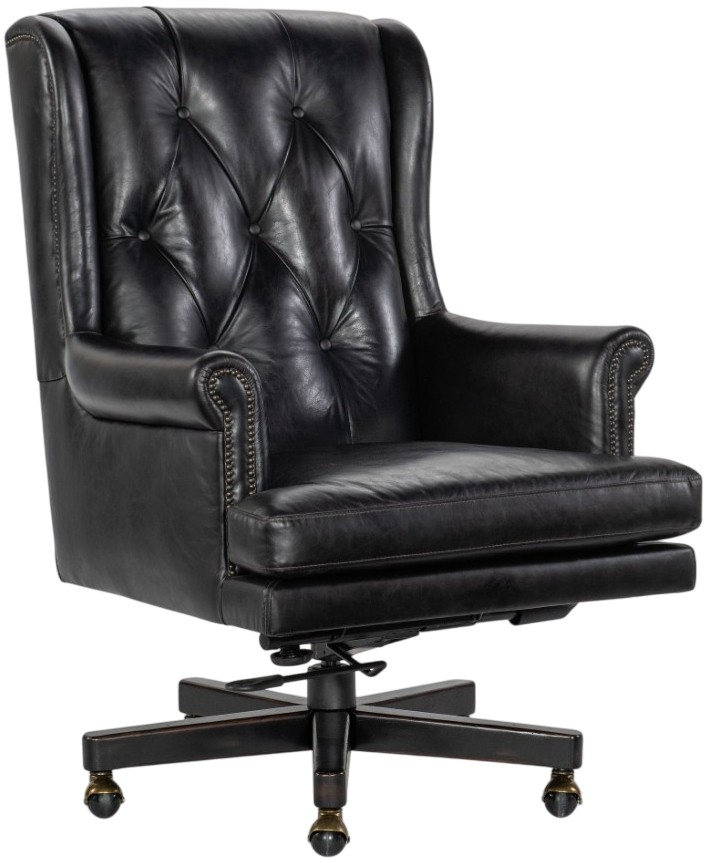 The Charleston executive swivel tilt chair combines timeless craftsmanship with executive comfort. Upholstered in rich black leather, it features a smooth swivel and tilt mechanism for effortless movement. Its stately design, accented with detailed stitching, adds sophistication and durability to any professional or home office space.Read More