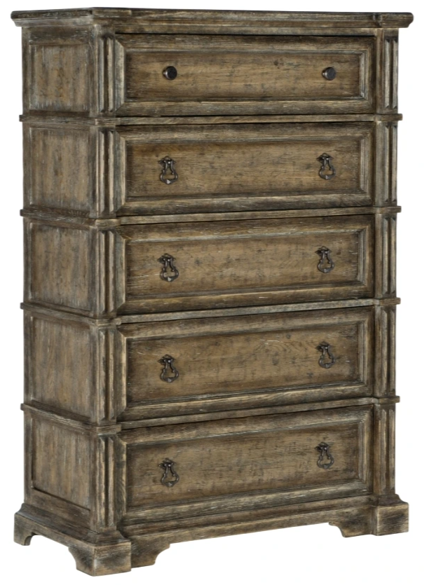 With a down-to-earth craftsman-like character evoking the neutral color tones of the open prairie, the Ross Prairie five-drawer chest combines a distinctive case front design with framed drawers and key-latch shaped ring-pull hardware in a gunmetal color. Chunky feet and architectural corner brackets bring flair to this focal point piece for your bedroom refuge.Read More