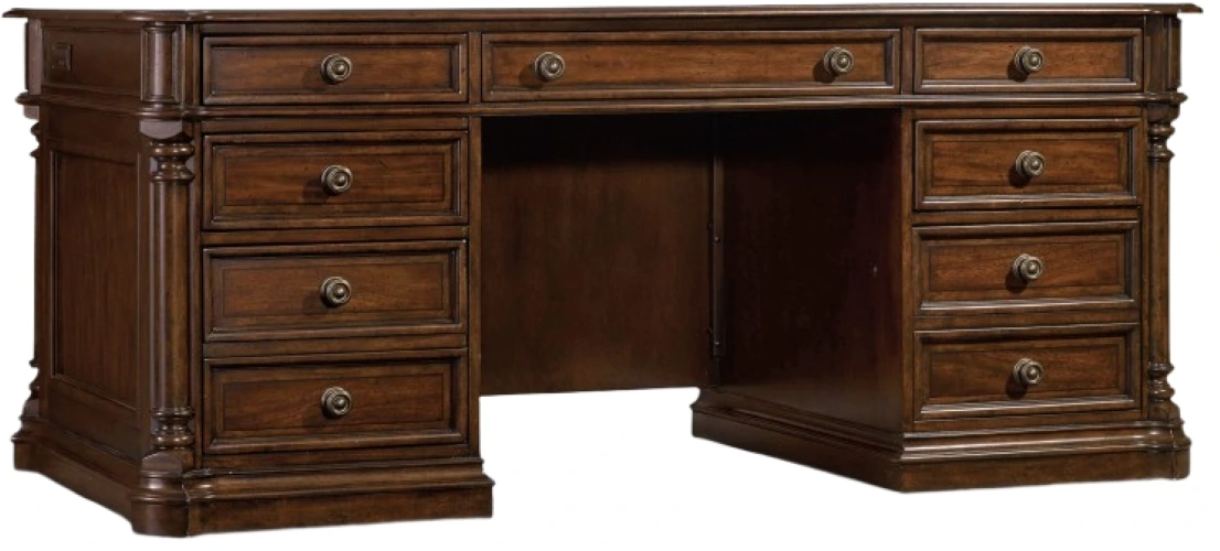 Create an inspiring workspace with the stunning Leesburg executive desk with a fashionable flair and classic design details like column motifs and decorative swirl mahogany and ebony veneers. The light distressing takes traditional style to a more casual and inviting place.Read More