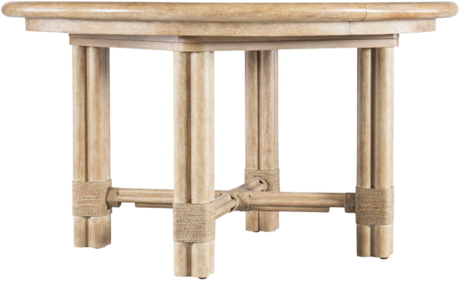 With a tropical retreat-inspired vibe accented by organic details, the Retreat pole rattan round dining table has a bundled-pole-designed motif with rope accents. Crafted of oak veneers, it features the sand-colored dune finish, transparent by design to reveal unique grain patterns of the veneer.Read More