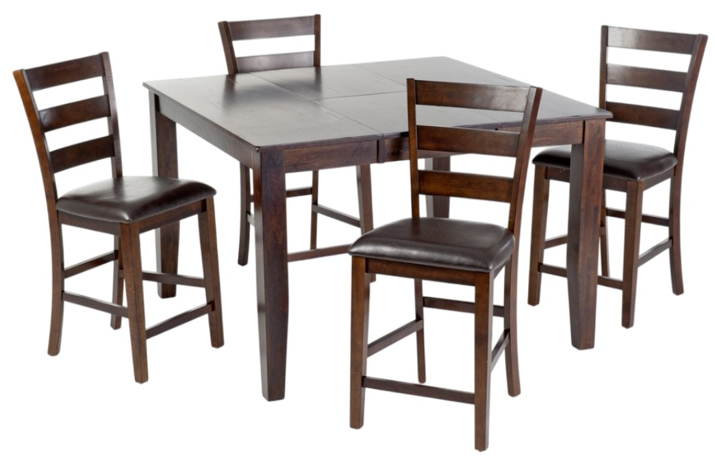 54" x 36"L four leg counter height table has an 18" butterfly leaf, extending the table to 54" square. Shown with ladder back stools.