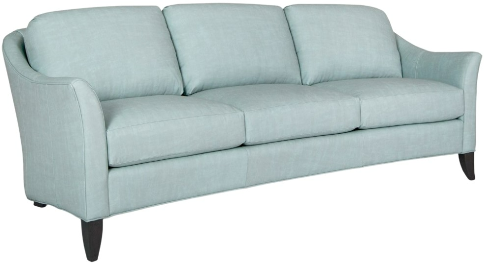 With a subtle curved design along the front and back, it's complemented by exposed tapered wood legs. Crafted for comfort, this three-seater boasts a semi-attached back, flair arms, and box seat cushion backrest. Available in various wood finish options and American-made custom upholstery, it's the perfect blend of style and quality for your living space.Read More